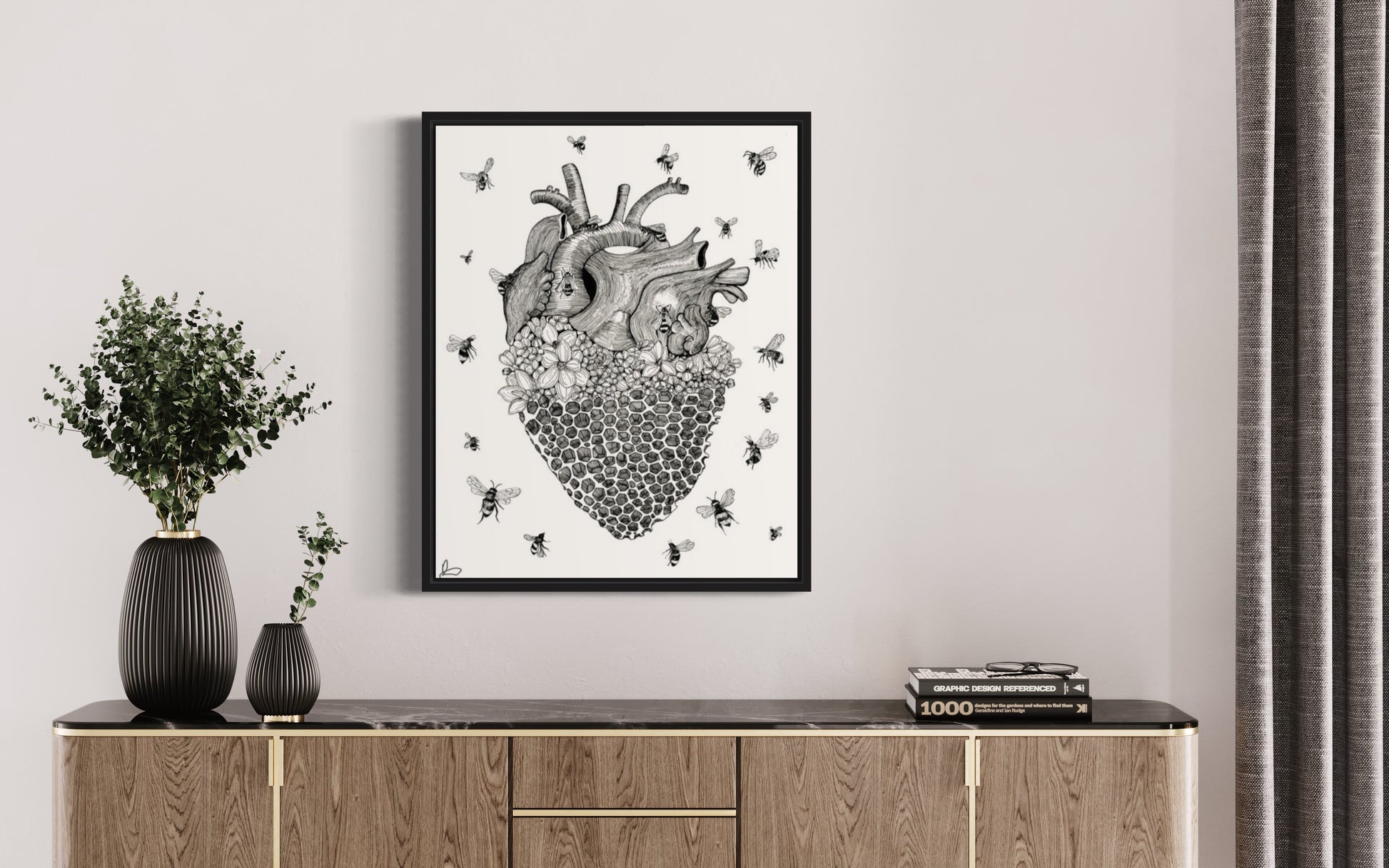 Product specifications: Limited edition (25) canvas made of a cotton and polyester blend, featuring a unique proprietary coating and encased in a black pinewood frame.