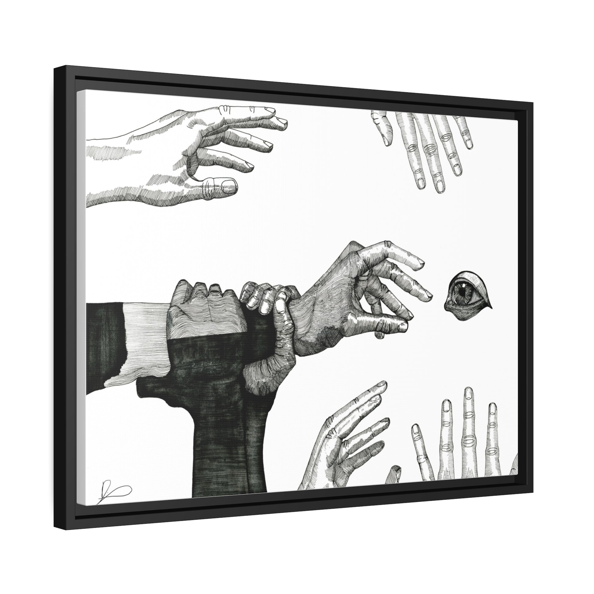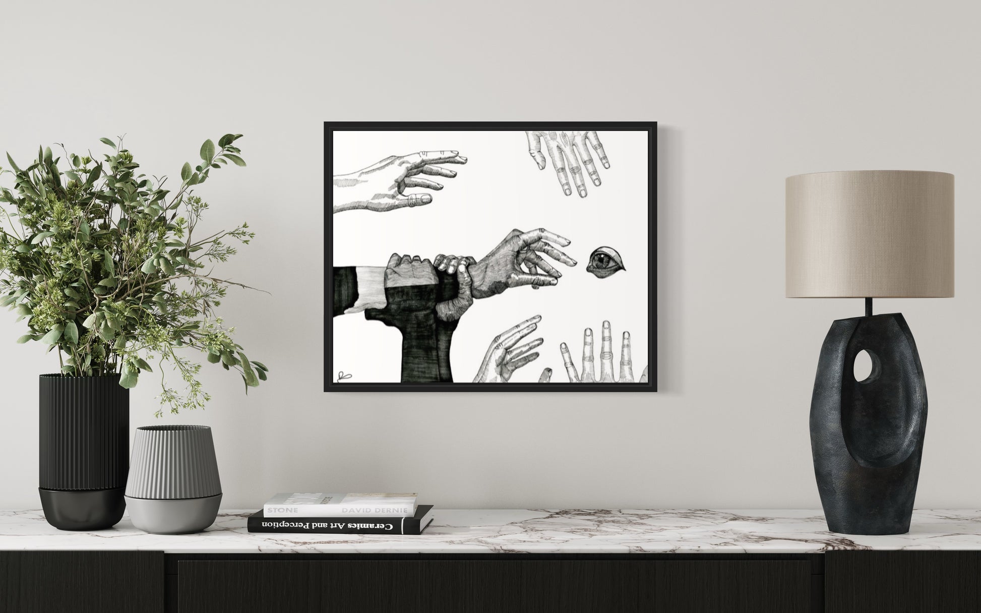 Product specifications: Limited edition (25) canvas made of a cotton and polyester blend, featuring a unique proprietary coating and encased in a black pinewood frame.