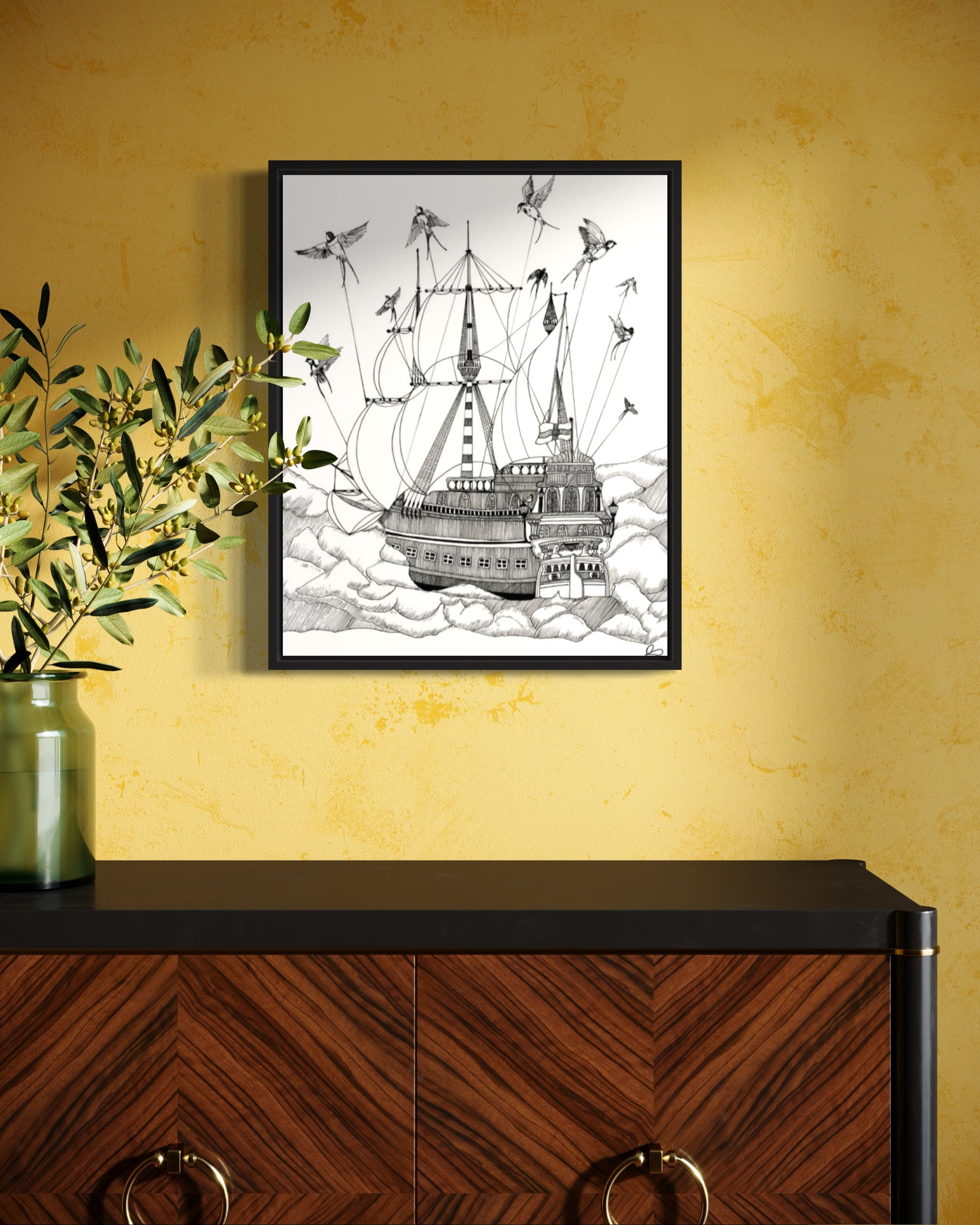 Product specifications: Limited edition (25) canvas made of a cotton and polyester blend, featuring a unique proprietary coating and encased in a black pinewood frame.